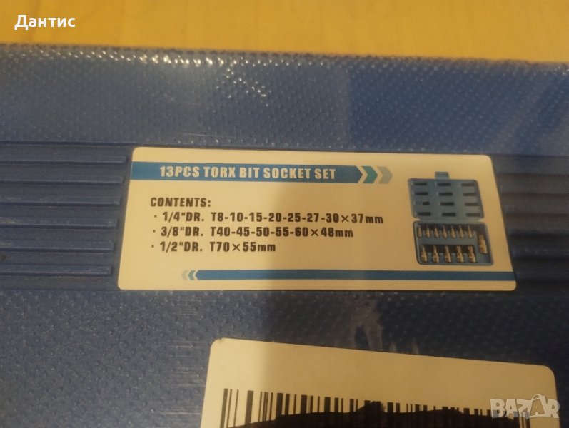 Включва: Комплект накрайници Torx от 13 бр., 7 вида 1/4 инчови устройства: T8, T10, T15, T20, T25, T27, T30; 5 вида дискове 3/8 инча: T40, T45, T47, T50, T55; Тип задвижване 1 1/2 инча: T60.