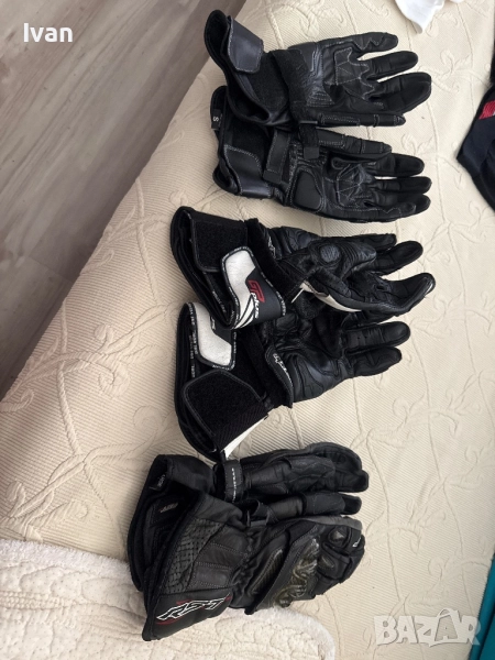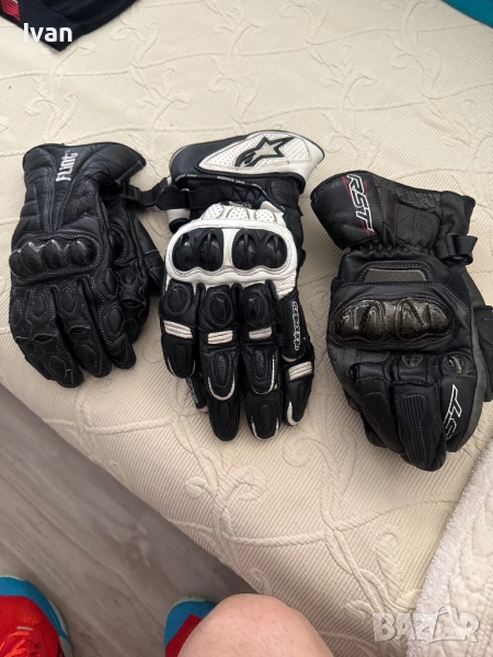 3 чифта ръкавици. Черни RST с размер s. Черните Flint са с размер S. И трита чифта ръкавици са за хора с малки ръце. Цената на черните RST е 50лева, Черните Flint са 45лева, а на белите Alpinestars 170лева. При интерес на телефона или изпратете съобщение тук в базар.