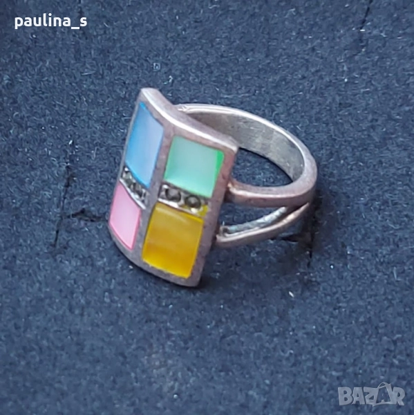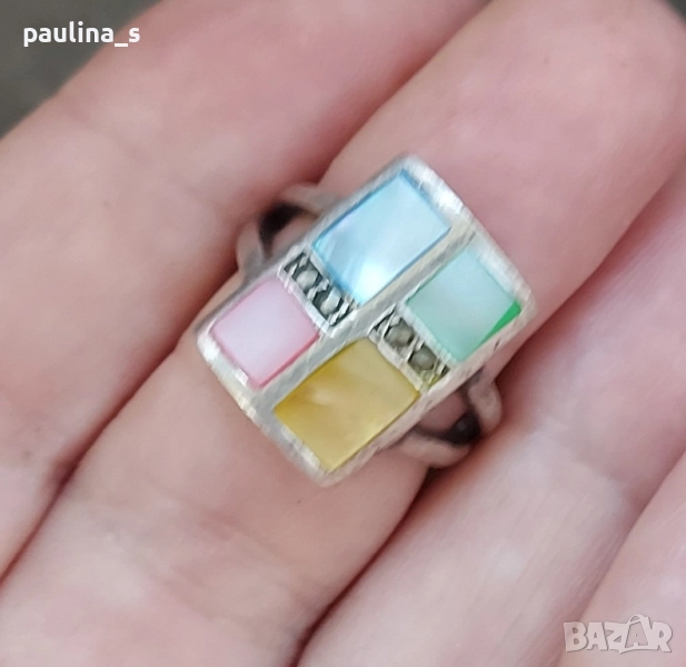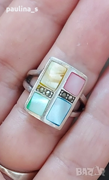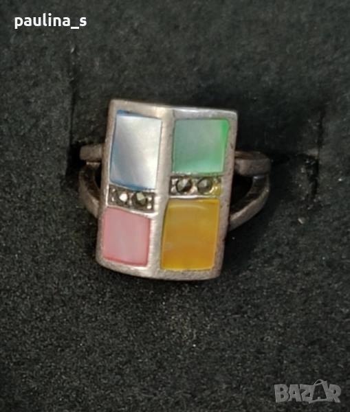 2️⃣. Цената е крайна, без пазарлъци 59,99лв. Винтидж / Масивен сребърен пръстен проба 925 с четири цвята седеф и марказити, с ефект на Черен диамант. Пръстенът е размер 16мм / 6. Масивен, красив и ефектен, семейно бижу. Мащабирането е на дланта, не се продава на грамаж, има колекционерска стойност и цена.
