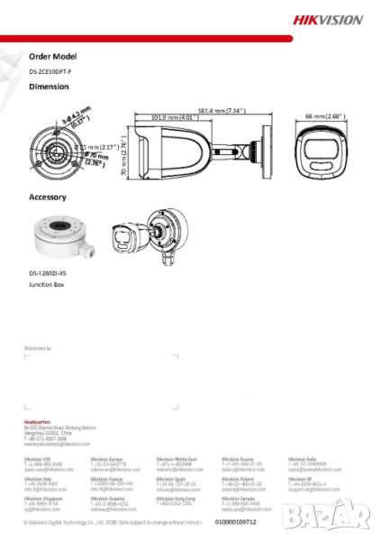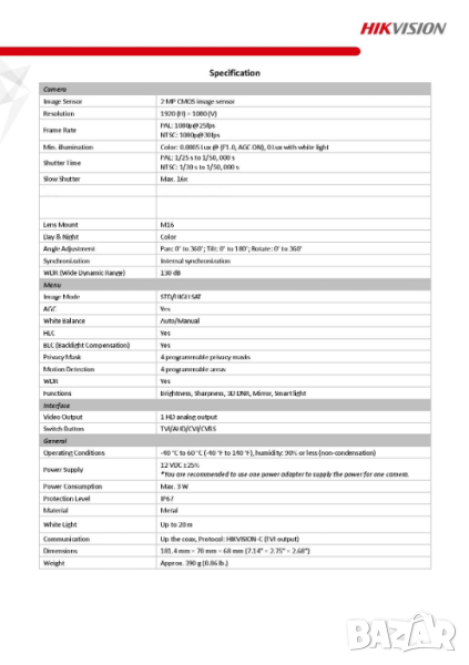 [email protected] (0 Lux white light on); фиксиран обектив 2.8 мм с хоризонтален ъгъл 98°; вградено Smart Light осветление с бяла светлина до 20м; OSD меню с контрол по коаксиалния кабел; 130dB WDR; 3D DNR филтър; AGC, HLC, BLC (Backlight Compensation), Privacy mask (4 програмируеми зони), Functions Brightness, Sharpness, 3D DNR, Mirror, 4 in 1 video output – избираем HD-TVI / AHD / CVI / CVBS режим на работа; за външен монтаж (IP67), метална – 370гр., 12Vdc/3W.