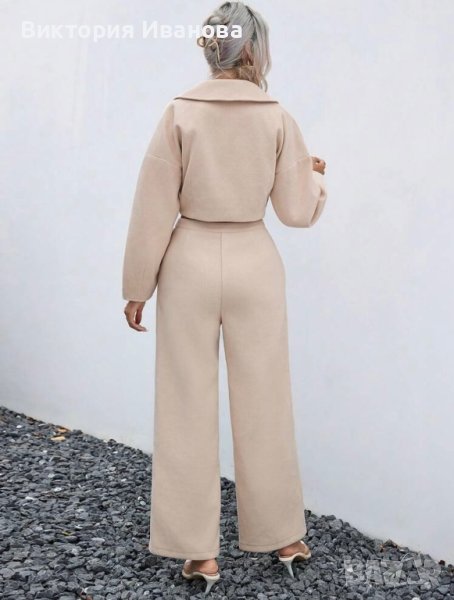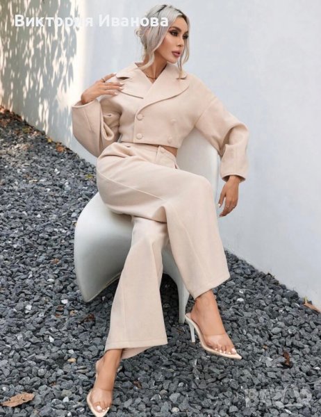Стилен комплект в бежаво сако и панталон с висока талия.