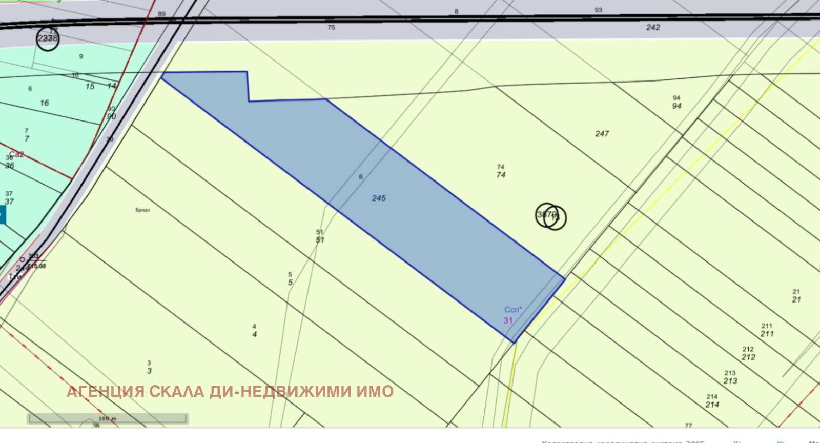 Агенция 'Скала Ди' Ви предлага ПИ, находящ се в с Мало Бучино, местност 'Бродо'. Имота е 13244 кв.м, попада в зона ССП, /Земеделска зона със специфичен режим/Плътност 1%, Кинт 0,02. Тази зона по същество е земеделска, но със специфичен режим допускащ допълнителни обслужващи функции за аграрен туризъм и отдих. Застрояване за нуждите на аграрния туризъм се допуска след изграждането на постройките, свързани с ползването на земеделските земи.Селото се намира на територията на община Овча купел, достъпа с градски транспорт е с автобус 56, който пътува до метростанция 'Вардар'. Код 33-25836.