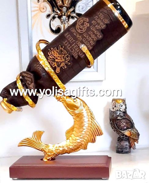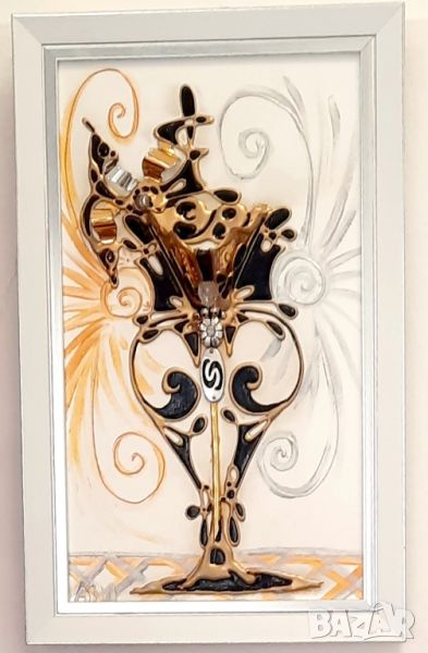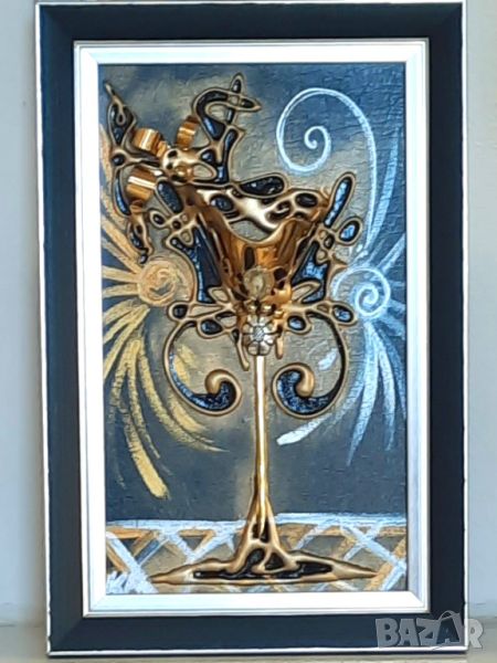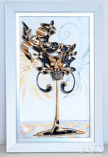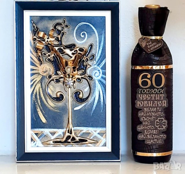 Картина Чашата на изобилието - металопластика в комплект с бутилка декорирана с кожа във формата на торбичка и дървена плочка със златни цифри, и оригинално пожелание.