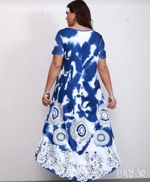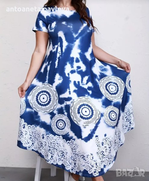 Много хубава тежка материя ,която не се мачка .Роклята е дълга и стои страхотно на по-пълни дами .За гр об .136см
