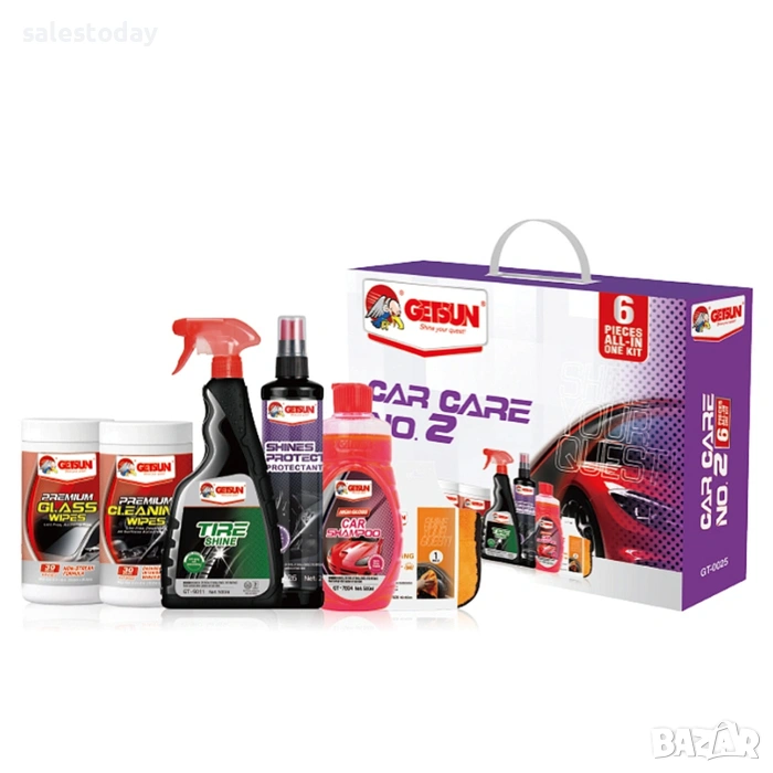 Комплект за почистване на автомобил Getsun е практичен и универсален комплект, включващ шест основни продукта за пълна грижа за автомобила – от външното почистване и защита на боята до детайлната поддръжка на интериора. Комплектът е създаден за хора, които търсят лесно, ефективно и удобно решение за поддържане на автомобила в отлично състояние.