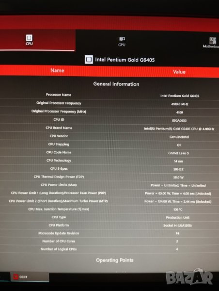Процесор: Pentium Gold 6405 /Intel Comet Lake, сокет LGA1200, 2C, 4T, 4.1GHz, TDP 58W/