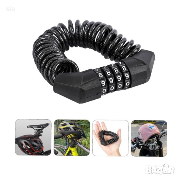 велосипедОсигурява сигурност на Вашият велосипедДебело стоманено въже с гумена обвивка.НАЧИН НА УПОТРЕБА:Първоначален код за отключване: 0000.След първоначалното отключване на устройството, завъртете пластмасовия пръстен на 90º по посока на часовниковата стрелка, както е посочено на пръстена.Изберете новия четирицифрен код като завъртите пръстените с посочени числа на тях.След въвеждането на новия код, завъртете пластмасовия пръстен обратно, в първоначална позиция.При следващо отключване на устройството, използвайте новия създаден от Вас код.Запомнете новия код, защото няма връщане на оригиналните настройки.
