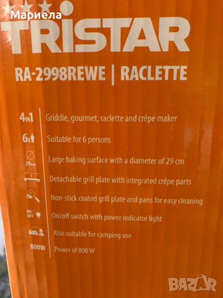 Раклета е закупен от разпродажби в Германия .С мултифункционалния раклет можете да приготвите широка гама от специалитети . Сладки или солени каквото Ви се похапва .С диаметър 29 см. и шест гурме тигана, подходящи за шестима души.Лесен за почистване благодарение на незалепващо покритие и подвижна плоча за скара .Благодарение на 800 W мощност раклетът бързо достига желаната температура.Много лесен за използване благодарение на превключвателя за включване/изключване и светлинния индикатор .