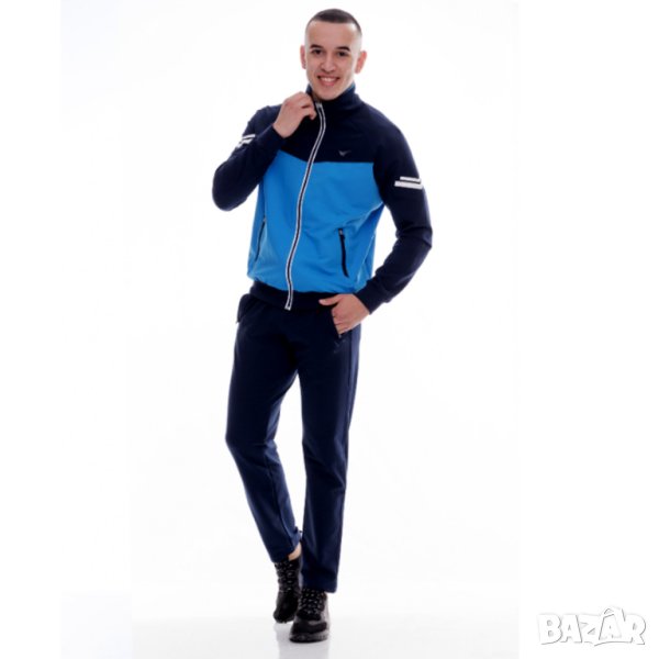 Мъжки спортен екип REDICS 240014, тъмносин със синьо, памук и ликра. Произведено в България. Материята е 77% памук, 17% полиестер и 6% еластан. Горнището има 2 джоба, долнището също има 2 джоба. Всички джобове са със ципове. Долнището е с прав крачол. Високо качество на материя и изработка.