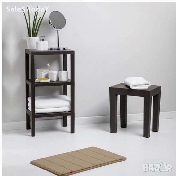 Етажерка с пластмасова рамка и 3 пластмасови рафта в черен цвят с дървесен ефект. Рафтовете са на разстояние 24 см, сглобяването е бързо и лесно, не са необходими инструменти. Подходящ е както за банята, така и за кухнята, тъй като материалът му е водоустойчив.