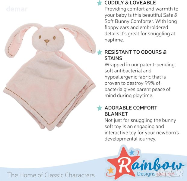 Safe & Soft Bunny Comforter е перфектен подарък за новопостъпили, включващ пастелно розов нюанс и привлекателен дизайн, който със сигурност ще се превърне в ценен фаворит. Със своите дълги, висящи уши и бродирани детайли, това зайче завивка предлага пухкав и симпатичен приятел за гушкане на бебета, което го прави прекрасно допълнение към всяка колекция играчки за новородени. Изработен от изключително мек материал, той е нежен към деликатната кожа и идеален за успокояваща дрямка. Освен това неговата устойчивост на миризми и петна гарантира чистота и издръжливост. Освен гушкането, този утешител служи като игрив спътник, подобрявайки сензорното развитие и времето за игра със своите меки, интерактивни функции.