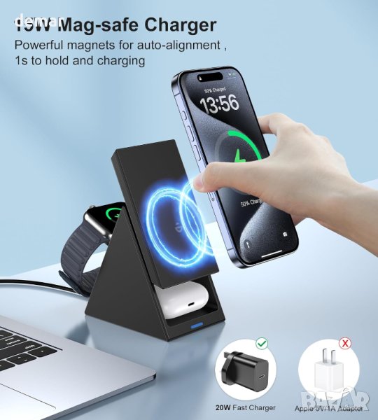 3-в-1 безжична станция за зареждане, проектирана да рационализира изживяването ви при зареждане. Със специални магнити той осигурява прецизно подравняване за iPhone, AirPods и Apple Watch, поддържайки сигурна връзка във всякаква ориентация. Бързо и безопасно зареждане за iPhone 15/14/13/12 модели, достигане на пълна батерия само за 3-3.5 часа. Сгъваемият и въртящ се дизайн позволява универсална употреба, удвоявайки се като стойка за телефон. Съвместимо с широк набор от устройства, включително iPhone, iWatch Ultra и AirPods. Пакетът включва 3-в-1 станция за безжично зареждане, 20W PD