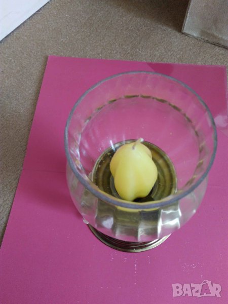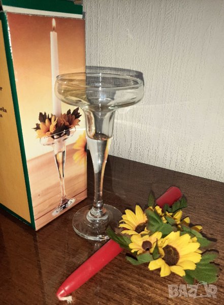3. Стъклен свещник с метална основа (тя е от ламарина, не е масивна), заедно със свещ, ново, в оригиналната опаковка - 5 Евро.