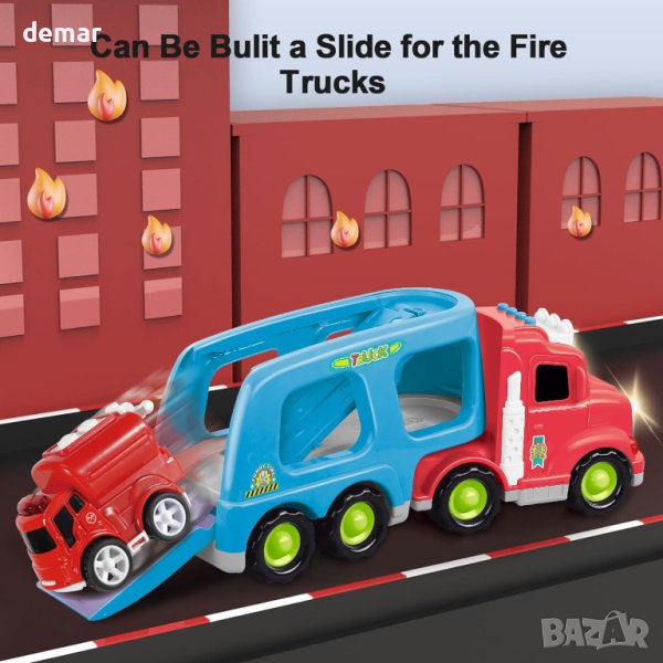 Този комплект играчки с пожарна кола е жизнено допълнение към колекцията от играчки на всяко дете, включващ 1 голям транспортен камион и 4 малки противопожарни коли с двуетажно ремарке и инерционно колело за плавно движение. Привлекателните звукови ефекти и светлини на комплекта, активирани с бутон, подобряват вълнението от играта, изисквайки 3 батерии AA (не са включени). Проектиран да разпалва въображението на децата, той включва линейки с подвижни стълби за реалистични спасителни сценарии, насърчаващи творческата игра. Изработени от издръжлива, безопасна и екологична ABS пластмаса, тези играчки са здрави и безопасни за децата. Идеален подарък, той е перфектен за стимулиране на любопитството и въображението при деца на възраст от 3 до 7 години, което го прави фантастичен избор за рожден ден, Коледа или друг повод.