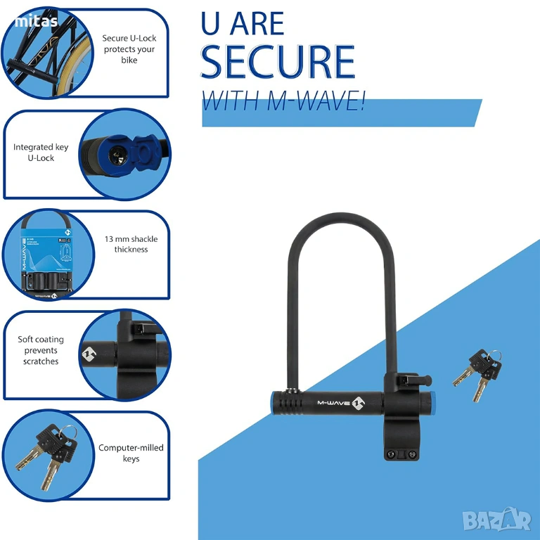 Заключващото устройство тип „скоба“ (U-lock) на германската марка M-WAVE е надеждно решение за защита на вашия велосипед или електрическо превозно средство срещу кражба. Със своята масивна конструкция и закалена стомана, този модел предлага високо ниво на сигурност, като ефективно се противопоставя на опити за срязване или огъване. Проектирано е да осигури спокойствие при паркиране в градска среда или на обществени места.