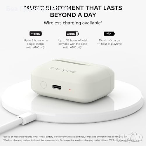 Дълготрайна батерия: До 8 часа възпроизвеждане с едно зареждане и общо до 32 часа със зарядното калъфче.