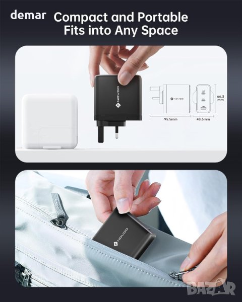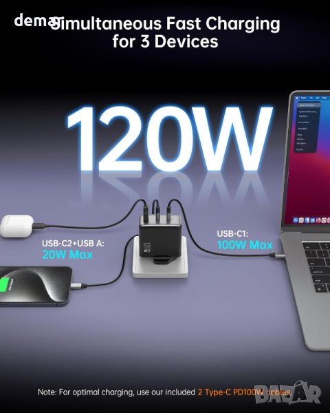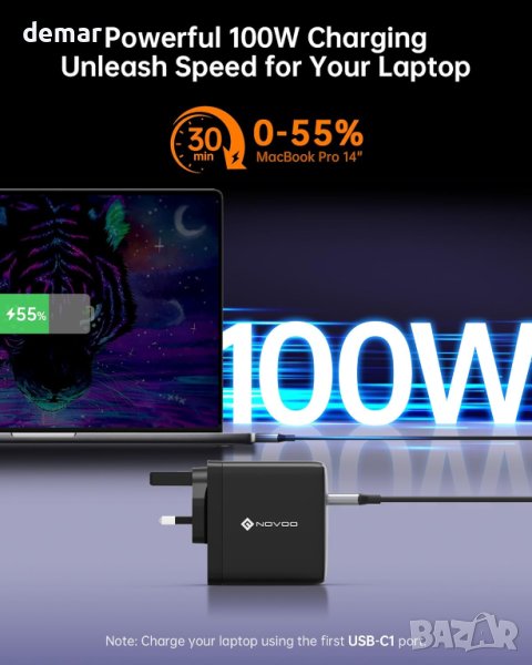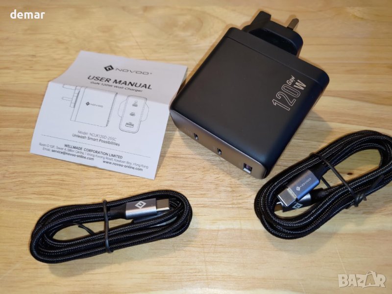 NOVOO RG120 120W USB C бързо зарядно устройство, включващо усъвършенствана GaN технология и 3 порта (2 USB-C, 1 USB-A) за едновременно зареждане. Изпитайте светкавично бързо зареждане, като зарежда MacBook Pro 14" до 50% само за 30 минути. Интелигентното разпределение на мощността се адаптира към използване на един, двоен или троен порт, предлагайки до 100 W на USB-C порт. Универсално съвместимо с MacBook Pro/Air, Dell XPS, серия iPhone 15, серия Galaxy S23 и други, то осигурява безопасно зареждане с вградени предпазни мерки срещу късо съединение, пренапрежение, прегряване и свръхток Поддържа множество протоколи за бързо зареждане като PD 3.0, PPS, QC, AFC, SCP, то е идеално за различни устройства. Компактено и леко, то е идеално за дома и пътуване. Пакетът включва зарядно устройство, два USB-C към USB-C кабела (1,5M и 1M) и ръководство за добре дошли.