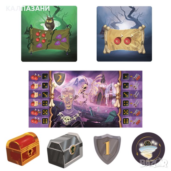 50 ковчежета: 20 дървени ковчежета, 20 метални ковчежета, 10 златни ковчежета, 1 контейнер за бонус чипове