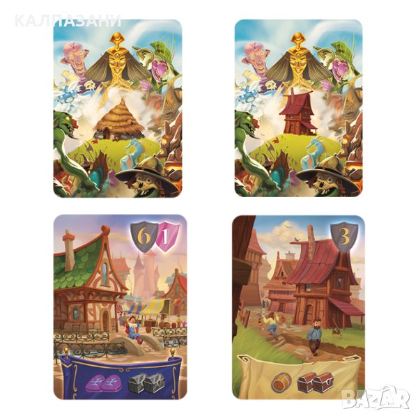 25 карти със селища: 1 карта с таверна, 7 карти с ферми, 7 карти със села, 10 карти с градове