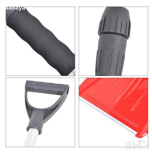 Многофункционална лопата за чистене на сняг с телескопична алуминиева дръжка с D-образна ръкохватка, която позволява захващане с по-дебели ръкавици.