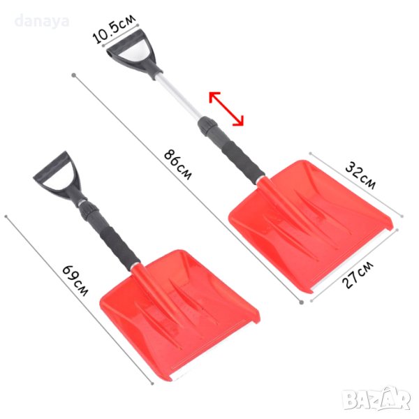 Лопата за сняг за кола със свиваща се дръжка за лесно съхранение. Благодарение на алуминиевата лента в края на лопатата ще може да загребвате снега по-лесно и по-бързо. Здрава и практична лопата за сняг, изработена от подсилена, полипропиленова пластмаса. Компактен размер – лопатата е подходяща за всички видове автомобили.