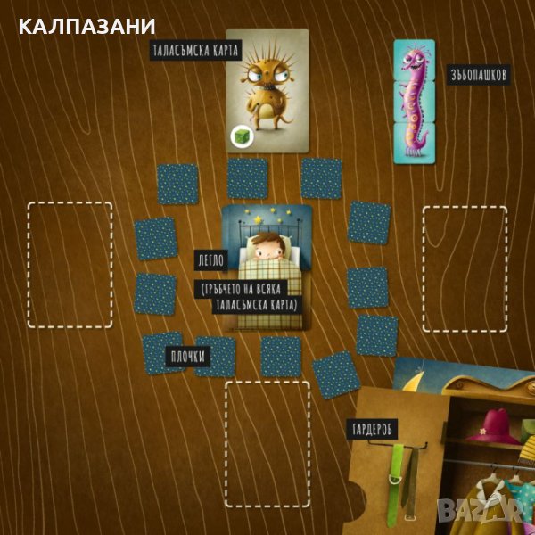 На смрачаване светът изглежда различен. Тайнствени сенки се катерят по стените, таласъми и привидения се спотайват под леглото. Не можеш да заспиш? Нима те е страх от тези пакостници?! За това имаме чудесен лек – изиграй една игра и заключи таласъмите в гардероба!
