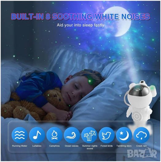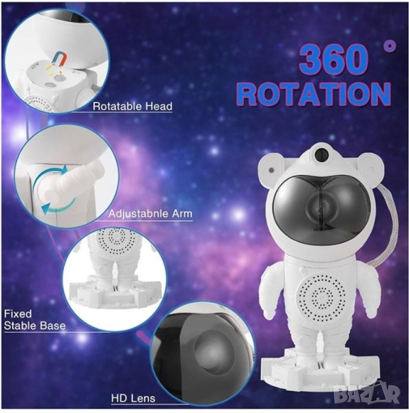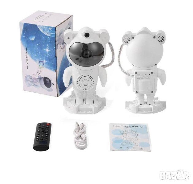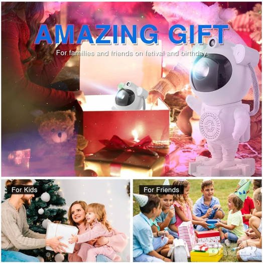 Лазерният проектор АСТРОНАВТ ще създаде цветни, непредсказуеми мъглявини, звездни галактики и красиво мигащи звезди а комбинацията от цветове ще ви напомни за най-релаксиращата нощ под звездите. Тази детска нощна лампа проектор изглежда като астронавт, а главата на астронавта е свързана с магнит към тялото за лесно регулиране на ъгъла на проекция на зведното небе. Светлинните ефекти се проектират върху стените и тавана, създавайки реалистично звездно нощно небе, осигурявайки релаксираща и комфортна атмосфера и карайки ви да се чувствате като на разходка сред звездите. Допълнителна атракция е възможността за възпроизвеждане на музика от телефона чрез Bluetooth.