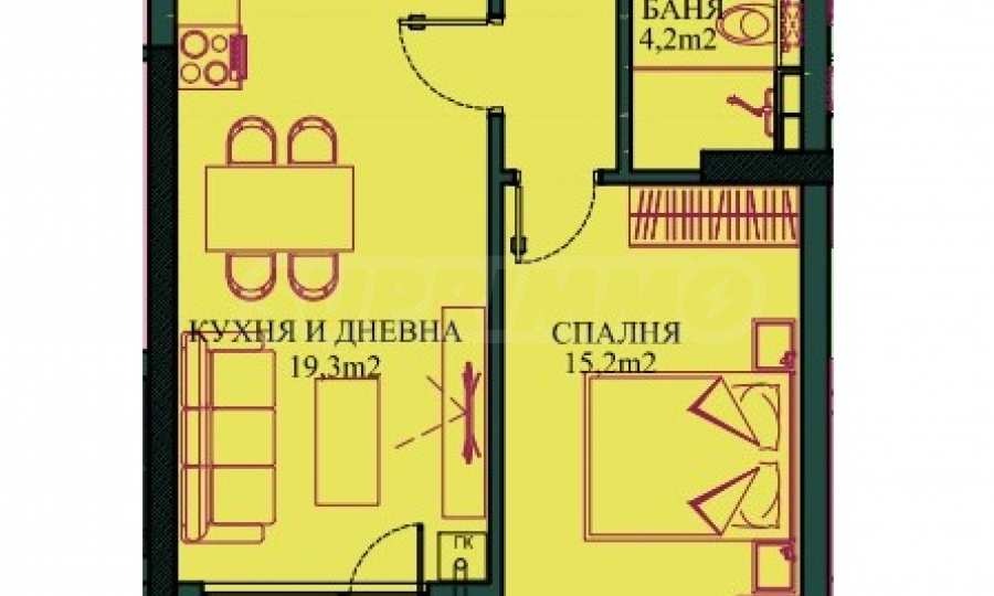 Имотът е разположен на 1-ви етаж и има 66.07 кв.м обща площ. Състои се от антре, всекидневна, спалня, килер, баня с тоалетна и градинска тераса с площ 4.96 кв.м.
