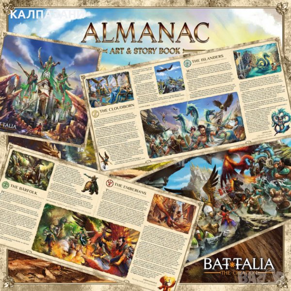 В Battalia: The Creation поемате ролята на един от четири враждуващи народа - Облачнородените, Живите Въглени, Мечият Народ и Островитяните. В борбата за победа всеки от вас се стреми да подобри своето тесте с карти с по-ефективни бойни единици и артефакти, чрез което не само развивате нацията си, но и влияете директно на игралното табло, като строите пътища и водите битки. Повишаването на нивата на вашите градове гарантира повече точки на края на играта, а наемането и движението на героите ви ви позволява да развалите плановете на опонентите си. Трябва да се съобразявате и да ползвате максимално ефективно Слънчевия Оракул - своеобразния календар на Баталия, чрез който можете да увеличите ефекта на артефактите си или да вземете ключови за нацията ви карти от своя цвят.