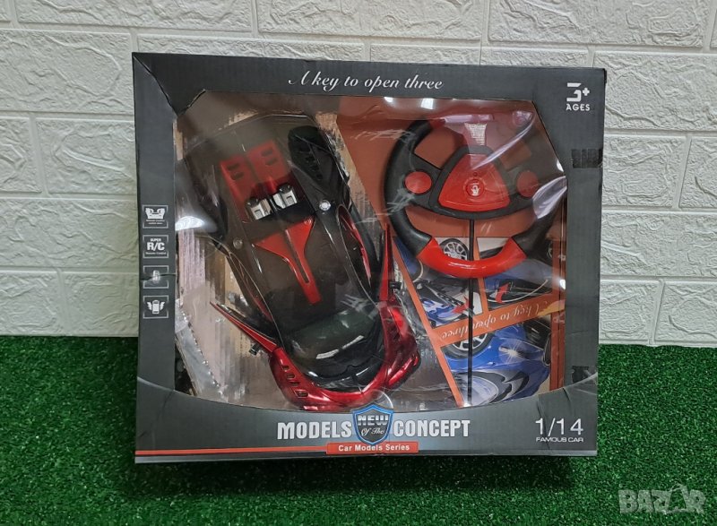 Голяма радиоуправляема кола Bugatti с отварящи се врати и капак.