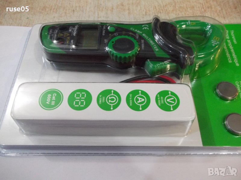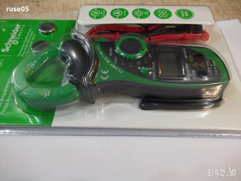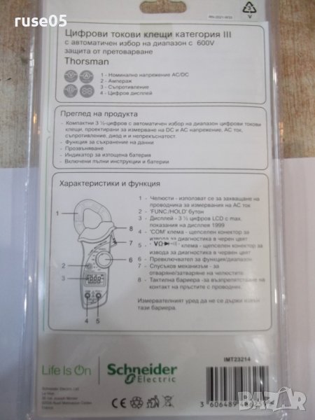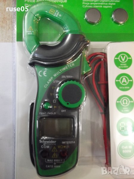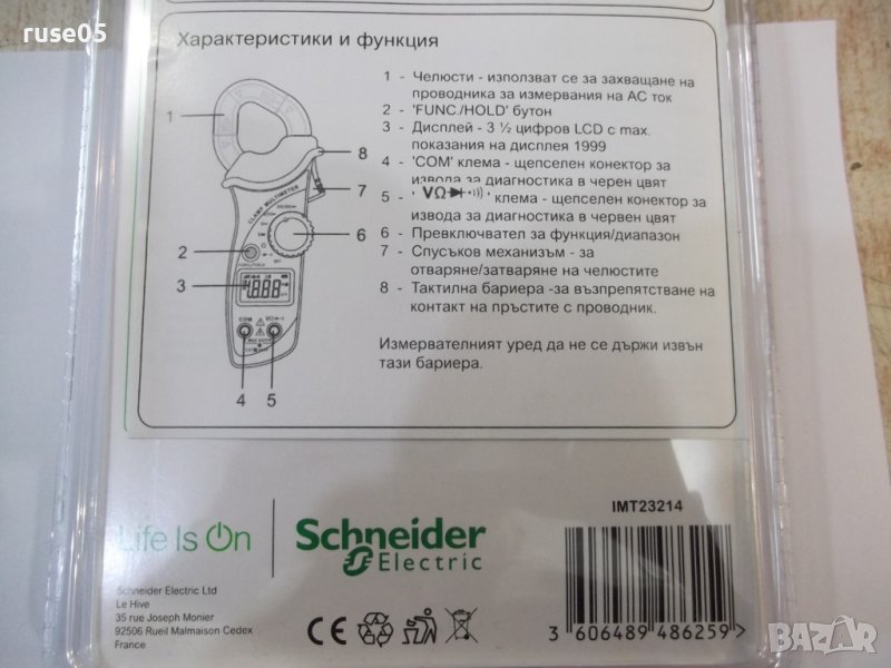 - Цифров измервателен уред "IMT23214" е компактен 3-цифрен цифров измервателен уред за автоматично подреждане на напрежениеэ , променлив ток , съпротивление , диод и непрекъснатост . Той е лесен за работа и е идеалният инструмент . Дисплей: 3-цифрен LCD дисплей , с максимално отчитане от 1999 г. Индикацията за превишаване на обхвата се показва на дисплея като "OL" . Индикацията за отрицателна полярност "-" се показва автоматично на дисплея . Честота на измерване: около 3 пъти в секунда . Грешка , причинена от неправилна позиция: 1% от показанията . Дизайн Проектиране на измервателни скоби Schneider Electric IMT23214 Акари Бутон FUNC./HOLD 1 . Използва се за влизане / излизане от режим на съдържание на данни при функции за измерване на напрежение , ток или съпротивление . 2. Използва се за превключване на инструмента между диод и функции за проверка на непрекъснатостта , когато въртящият се превключвател е в положение . Дисплей 3-цифрен LCD , с макс. показатели - 1999г Терминал "COM" Съединител за черен тестов проводник . Клема "VΩ" Конектор за червения тестов проводник . Избор на функция / обхват Използвайте , за да изберете желаната функция или обхват и да включите или изключите инструмента . Тригер Използва се за отваряне и затваряне на клещите . Защитна бариера Използва се за предотвратяване на контакт на кожата с измерения проводник .