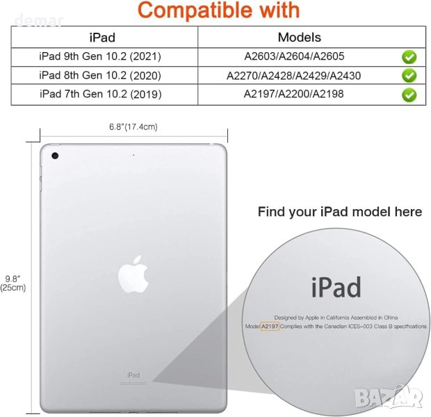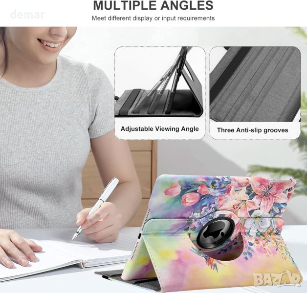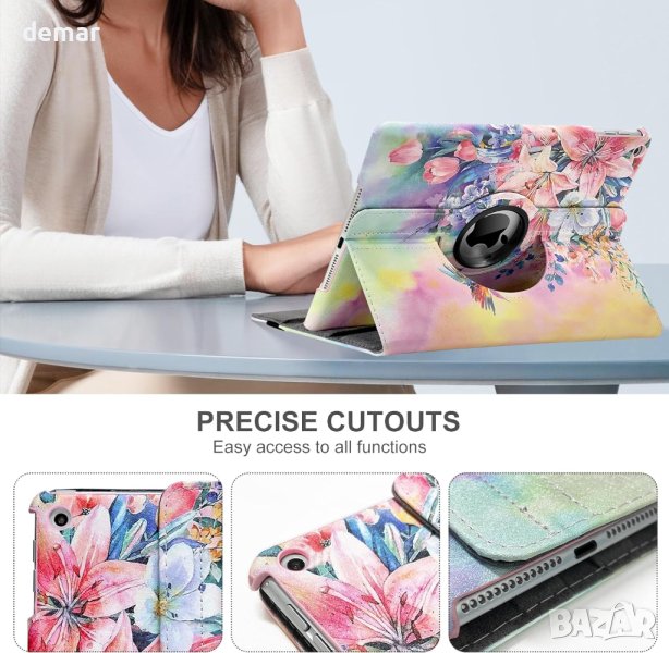 Този 9,7-инчов калъф за iPad е пригоден за моделите 6-то поколение 2018, 5-то поколение 2017, iPad Air 2 и iPad Air, като предлага защита на цялото тяло срещу удари, изпускания и ежедневни повреди със своя удароустойчив твърд гръб и мека подплата от микрофибър. Той разполага с въртящ се на 360 градуса завъртащ се за гъвкаво гледане, прецизни изрези за лесен достъп до всички портове и камери и лесна инсталация с щракване. Калъфът включва функция за автоматично събуждане/заспиване за енергийна ефективност, вградена каишка за ръка за сигурно боравене и еластична лента, за да държи iPad сигурно затворен, докато сте в движение.