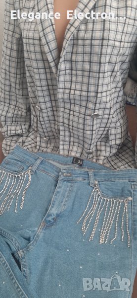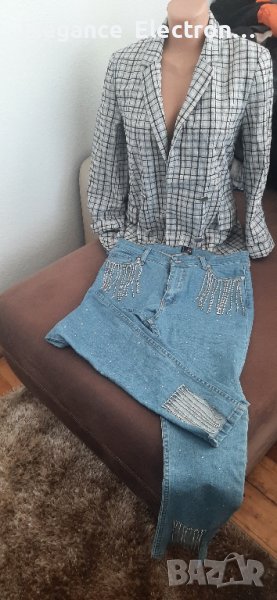 Продавам дамски спортно елегантен комплект Сако Straduvarius размерът му е Eur:S, Usa:S, Mex :26. Размери на сако : рамена 24см дължина на ръкав 53 см Дължина на сакото 70см, Ханш 80см,бюст 84см.Дънки Pocket Размерът е 32. Дължина крачол 93см Ханш 83см. Подходящ за всекидневна употреба. Носен е 2 пъти. За повече информация пишете отговарям бързо или звъннете на посочения телефон.