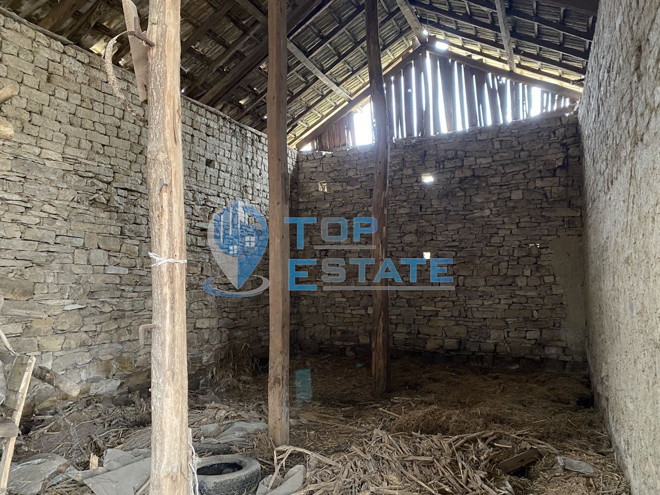дялан камък и тухла, като също така между етажите и под покрива има стоманобетонни елементи. Дворът е с площ от 691 кв. м, като в него са ситуирани стопанска постройка изградена от камък, кладенец и външна чешма. Номер на оферта: 2184. We speak English.