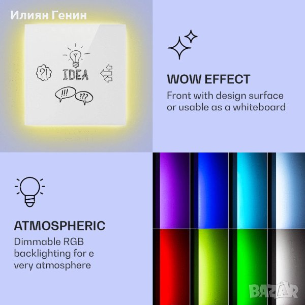 9 цвята на околната светлина: димируема подсветка в жълто, бяло, червено, светлосиньо, тъмносиньо, лилаво, светлозелено, тъмнозелено и тюркоазено