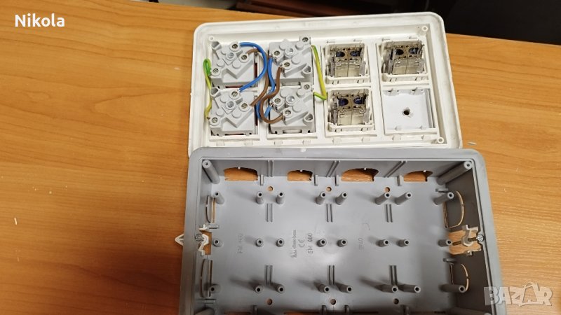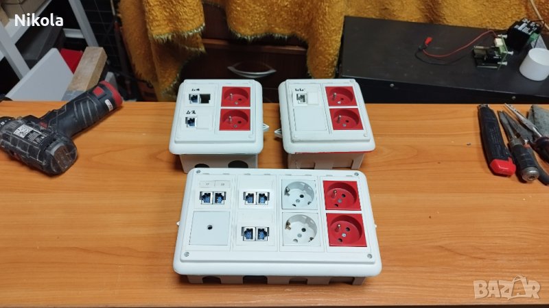 2) 5бр комплект със 6 гнезда за монтаж в гипсо картон като, е обурудвана с четири контакта и две компютърна розетка R& M - FTP C6. Външен размер на кутията 20/15/8см. Цена за един комплект 53лв