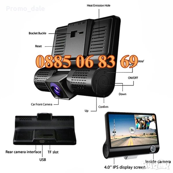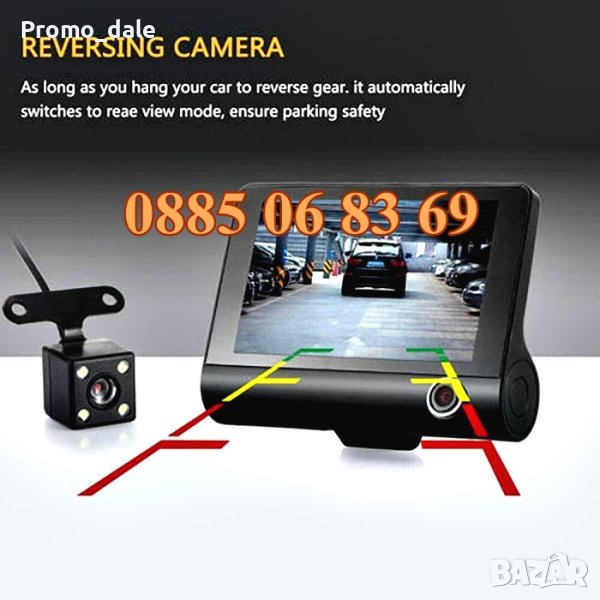 Видеорегистратор Full HD 1080P с 3 камери и дисплей 4 инча