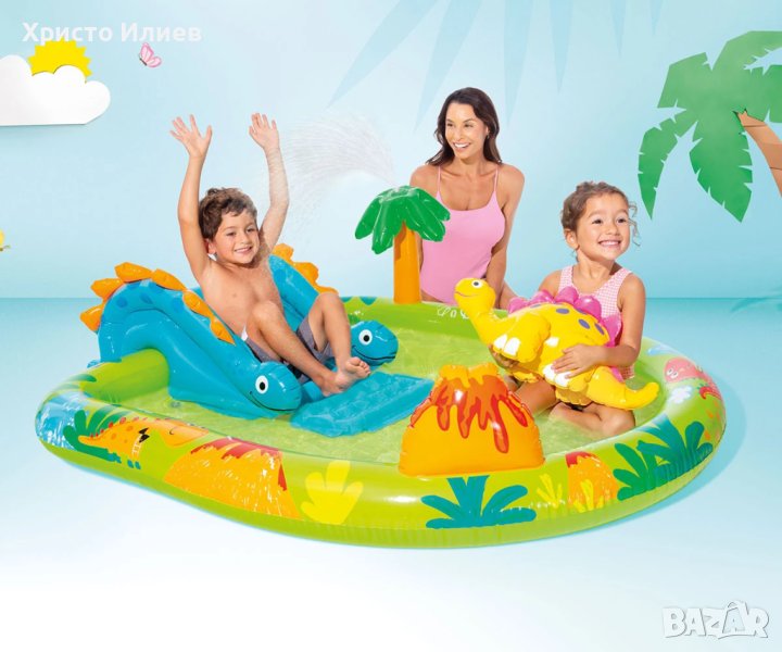 Насладете се на забавление на слънце в собствения си двор това лято с центъра за игра Дино от Intex. Идеален за най-малките, този надуваем басейн е идеален за топлите дни. По-малък и по-компактен, този воден център за игра е идеален за по-малки деца на възраст 2 години. Вашите деца ще се пръскат безопасно и ще развият увереност във водата в собствения си двор. Този динозавър ще бъде хит за вашите деца. С дължина от 191см и ширина 152см, вашите деца ще имат място да се пръскат и да играят на воля. В комплект с мини пързалка, палма, която пръска вода, и надуваем динозавър за часове игра, надуваемия център ще ги държи да играят през цялото лято. Победете жегата това лято със забавен басейн и център за игра, който ще усмихне лицата на вашите малки деца.