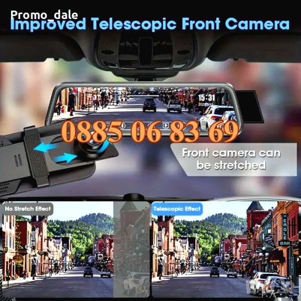 Огледало за автомобил с дисплей 9.66 инча е с две камери - предна на самото огледало и подвижна, подходяща за задно виждане, което Ви дава възможност едновременно да виждате какво се случва пред и зад колата.