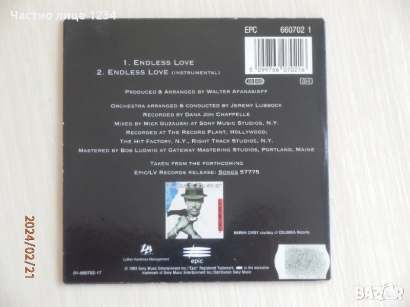 Luther Vandross & Mariah Carey - Endless Love - 1994 - CD single, снимка 1 - CD дискове - 44431038 Luther Vandross & Mariah Carey - Endless Love - 1994 - CD single, снимка 2 - CD дискове - 44431038 1/2