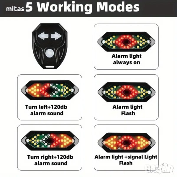 * Режим на работа: Червена задна светлина винаги включена, червена задна светлина включена, алармена светлина и светлини за включване, завийте наляво, завийте надясно