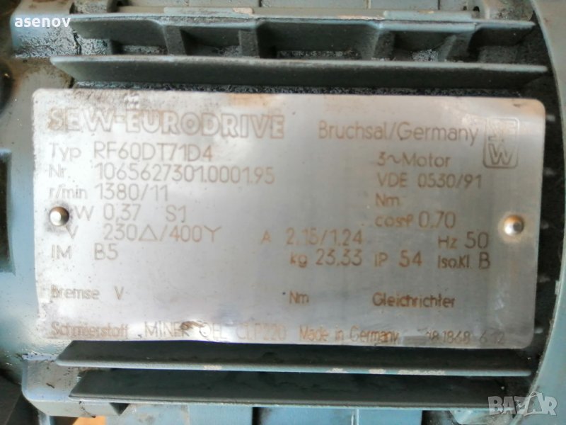 Продавам редуктор 11 оборота, с електрически двигател 1380 оборота, изход 11 оборота в минута, диаметър на ос 30 мм, тегло 23 кг, мощност 0,37 кв