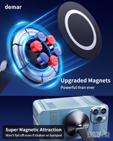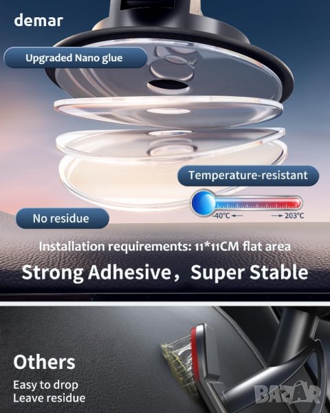 Този държач за телефон за кола е проектиран с мощно магнитно привличане, за да държи сигурно всички размери мобилни телефони, като гарантира, че те остават на място дори по неравни пътища. Той разполага с усъвършенствано 3M нано-силно лепило за изключителна температурна устойчивост и прилепване към различни арматурни табла, включително извити повърхности, без да оставя остатъци. Държачът се монтира и регулира лесно с една ръка, благодарение на регулируемата си основа, магнитна глава и телескопично рамо. Изработен от здрав метал, той осигурява оптимална производителност и стабилност, намалявайки вибрациите за по-плавно каране. Висококачествени компоненти като прецизни шпиндели, лагери и винтове осигуряват дългосрочна издръжливост на държача, което го прави надежден аксесоар за ежедневна употреба.