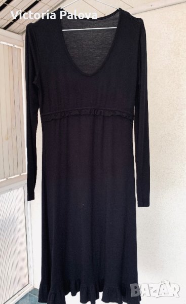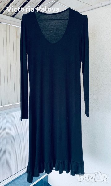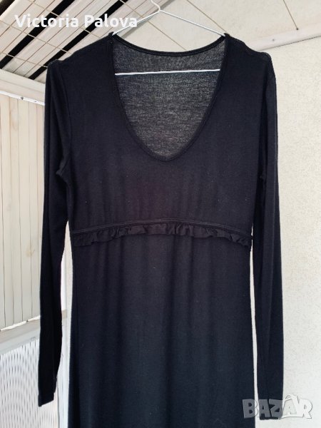 Роклята е семпла, но интересна - украсена е с нежни детайли отпред под бюста и в долния край. Трикотажна вискоза, тежка , разтеглива, много добре стои. Рамо - 42см, ГО - 46 см, дължина - 104-105см, ханш - 53 см, ръкав - 61см.