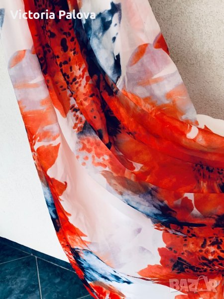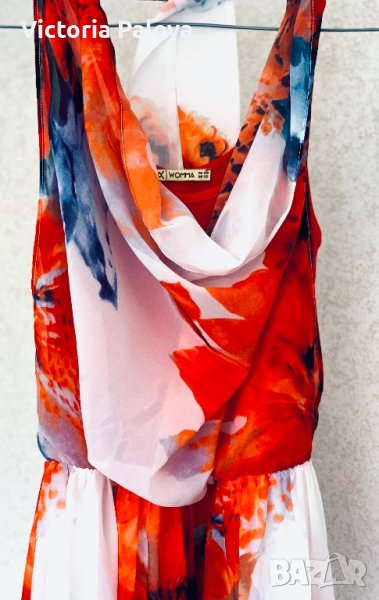 Роклята е дълга 135 см, много ярка, красива и “летяща”. В горната част е потник( разтеглив), предната част се завръзва на врата отзад и се получава една необикновена рокля.