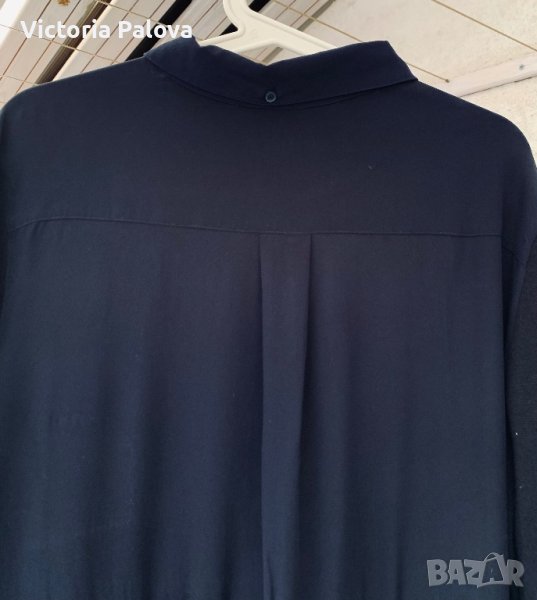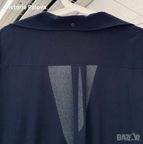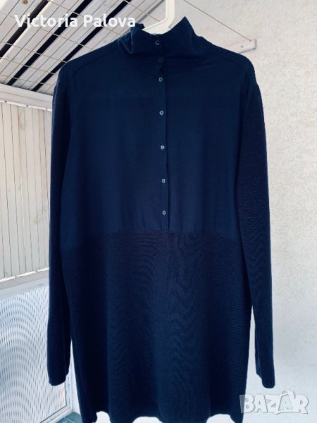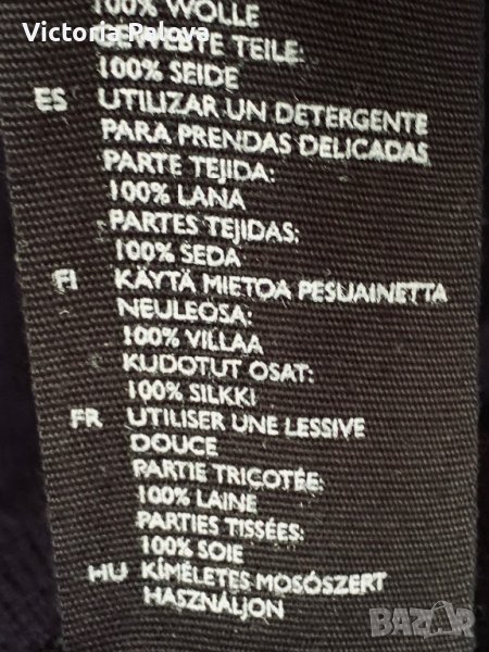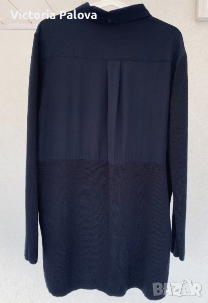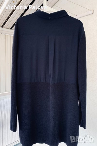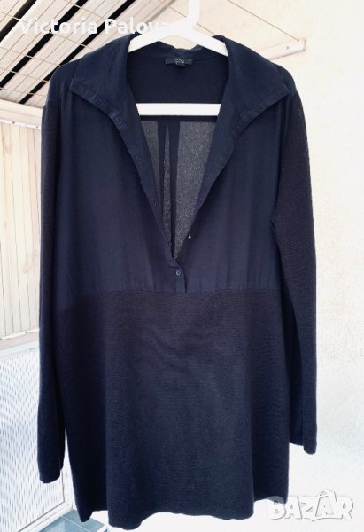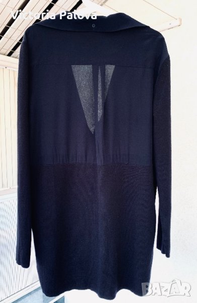 Нещо съвсем различно - невероятно съчетание на коприна и гладък меринос. Горната част е коприна, отпред с копчета, които позволяват вариации с якичка, която отзад също има едно копче; гърбът е с плоха. Ръкавите и долната част са меринос. Цветът е тъмносин до черно. Рамо - 46см, ГО -61см, дължина - 85см, ханш - 55см, ръкав - 65см.