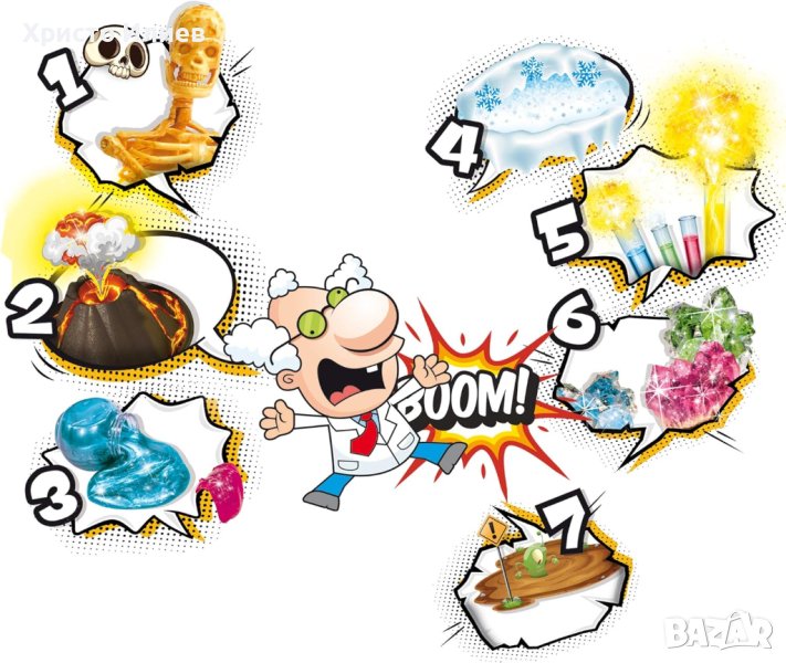 -натриев тиосулфат, лимонена киселина, натриев хидрогенкарбонат, железен прах, натриев хлорид, натриев полиакрилат, царевично нишесте, жълт и червен оцветител, модел на вулкан, епруветки,защитни очила и ръкавици