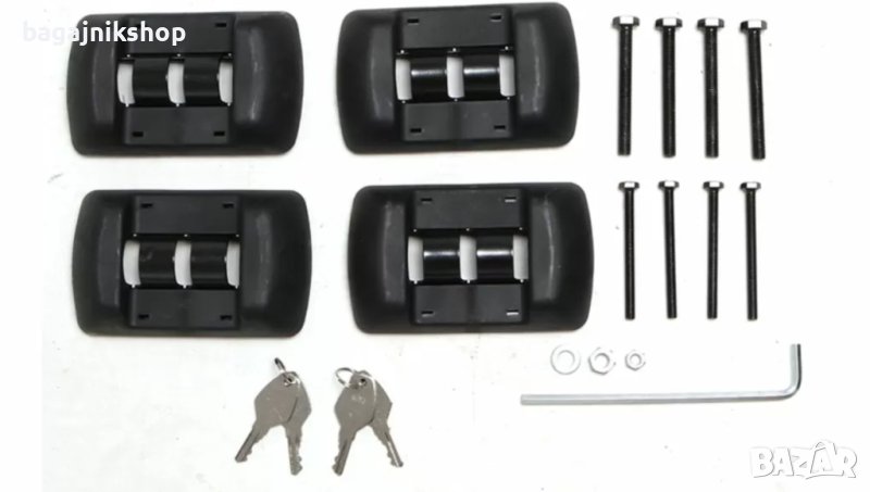 Комплекта включва: 2 напречни алуминиеви греди и механизъм за закрепяне със заключващ механизъм, 4 винта 6 мм и 4 винта 8 мм, 8 гайки, 4 шайби, 2бр. гумени уплътнения за горната част и 2 ключа