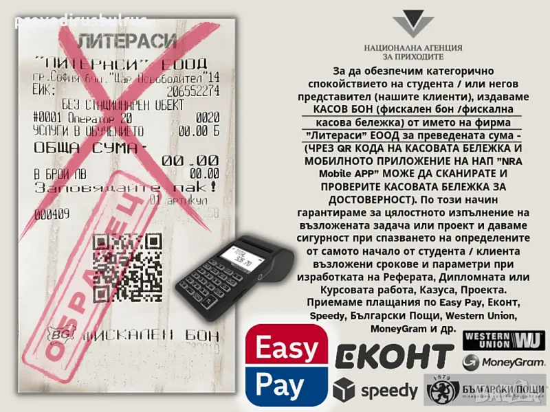 ▲☑ За да обезпечим категорично спокойствието на студента / или негов представител (нашите клиенти), издаваме КАСОВ БОН (фискален бон /фискална касова бележка) от името на фирма ”Литераси” ЕООД за преведената сума - (ЧРЕЗ QR КОДА НА КАСОВАТА БЕЛЕЖКА И МОБИЛНОТО ПРИЛОЖЕНИЕ НА НАП ”NRA Mobile APP” МОЖЕ ДА СКАНИРАТЕ И ПРОВЕРИТЕ КАСОВАТА БЕЛЕЖКА ЗА ДОСТОВЕРНОСТ). По този начин гарантираме за цялостното изпълнение на възложената задача или проект и даваме сигурност при спазването на определените от самото начало от студента / клиента възложени срокове и параметри при изработката на Реферата, Дипломната или Курсовата работа, Казуса, Проекта. ☑ Приемаме плащания по Еконт, Easy Pay, Български Пощи, ePay, Western Union, MoneyGram и др.