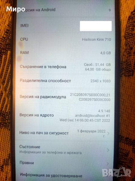 Процесор - Осемядрен Kirin 710 (4x2,2 GHz Cortex-A73 и 4x1,7 GHz Cortex-A53)